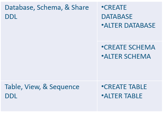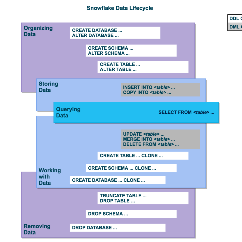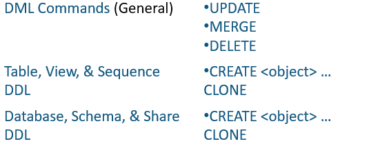 Once data is stored in a table, all standard DML operations can be performed on the data. In addition, Snowflake supports DDL actions such as cloning entire databases, schemas, and tables.