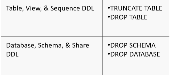 In addition to using the DML command, DELETE, to remove data from a table, you can truncate or drop an entire table. You can also drop entire schemas and databases.