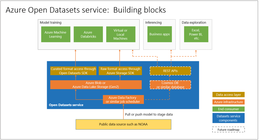 Azure Open Datasets curated public datasets that you can use to add scenario-specific features to machine learning solutions for more accurate models. Open Datasets are in the cloud on Microsoft Azure and are integrated into Azure Machine Learning and readily available to Azure Databricks and Machine Learning Studio (classic). You can also access the datasets through APIs and use them in other products, such as Power BI and Azure Data Factory.